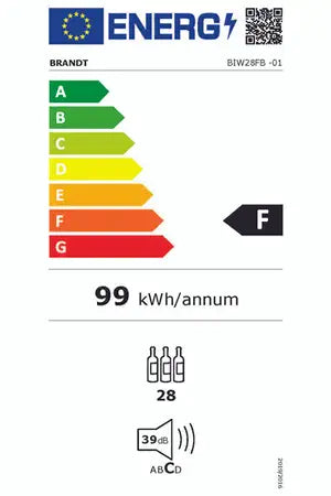 La cave à vin BIW28FB de chez Brandt est dotée d'une porte équipée filtre anti-UV. Elle dispose d'une capacité de 28 bouteilles. De plus, elle est équipée de 2 clayettes amovible en bois.