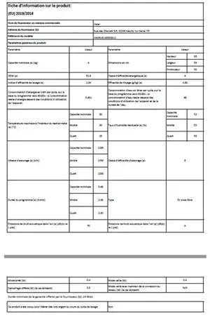 | Vitesse d'essorage (tours/min) |